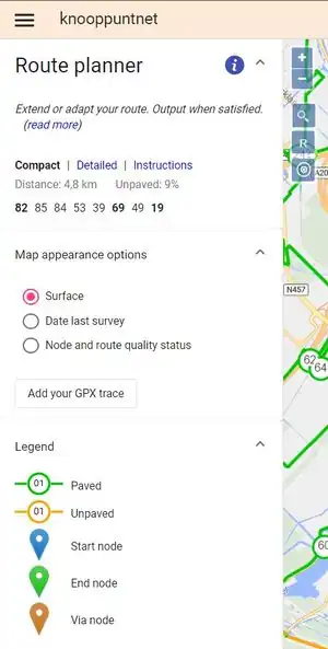 Click or tap the node you want to end your trip (or the the first part of it) with. The green end pin appears, and the shortest node route between the start and end pins is displayed. On the sidebar, the list of nodes along your route is displayed with the total distance and the percentage unpaved.