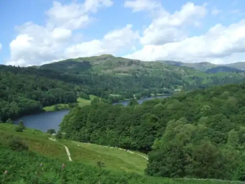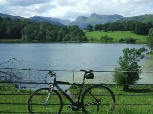 The view from by the campsite - Langdale Pikes over Loughrigg Tarn