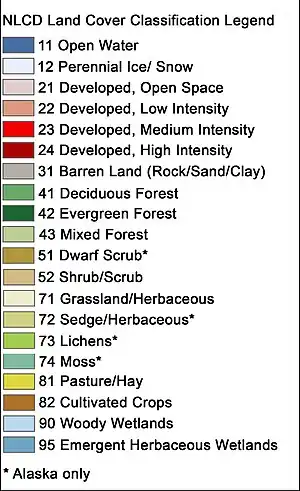 | See NLCD classification system defined by the Multi-Resolution Land Characteristics (MRLC) Consortium, a partnership of Federal agencies led by the U.S. Geological Survey. | ||