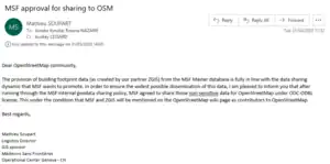 Data license: Permission to share was given in a private email and states: "The provision of building footprint data (as created by our partner ZGIS) from the MSF Master database is fully in line with the data sharing dynamic that MSF wants to promote. In order to ensure the widest possible dissemination of this data, I am pleased to inform you that after running through the MSF internal geodata sharing policy, MSF agreed to share those non-sensitive data for OpenStreetMap under ODC-ODBL license. This under the condition that MSF and ZGIS will be mentioned on the OpenStreetMap wiki page as contributors to OpenStreetMap."