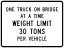 | R12-9 | One Truck on Bridge at a Time Weight Limit 30 Tons Per Vehicle | capacity:hgv=1 maxweight=30 st |