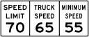 R2-4b | Combined Speed Limit With Minimum Speed | maxspeed=70 mph maxspeed:hgv=65 mph minspeed=55 mph