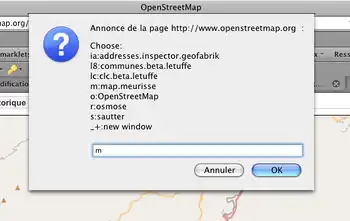 http://example.com/?lat=N&lon=N&zoom=N[&...]) chose your 'mapJumper bookmarklet in your bookmarks. - In the dialog, choose the server by taping its shortcut (e.g: o for www.openstreetmap.org) the entry must be 1 or 2 lower case letters.