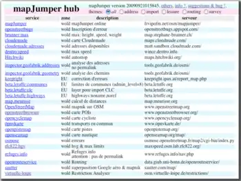 The mapJumper hub is a web page for jumping to a map. When call with valid parameters (lat, lon, zoom), the hub propose you a big selection of maps and services. By clicking on one of them, you jump to the map.
