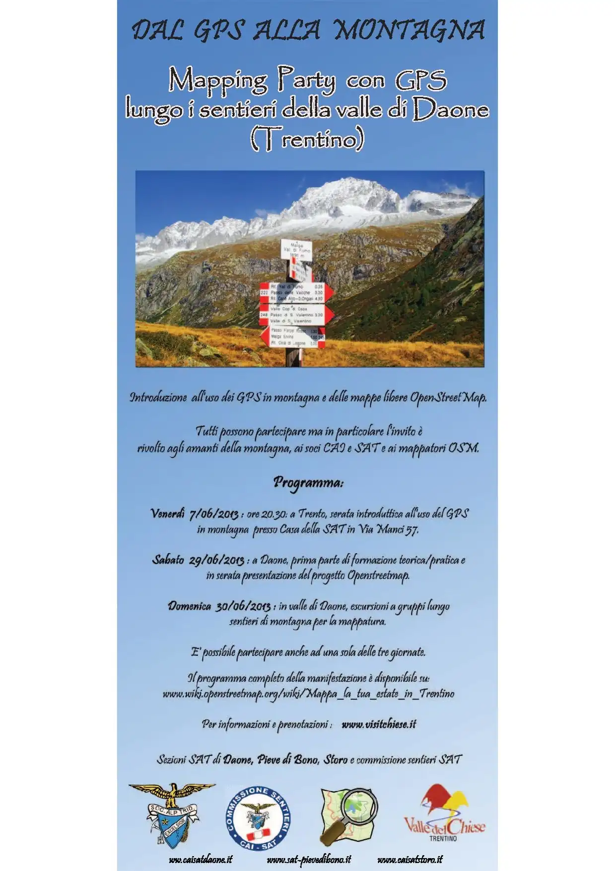 Un mapping party in montagna. Passeremo due giornate in valle del Chiese in Trentino: sabato 30 giugno introduzione all'uso del GPS, breve raccolta dati e presentazione del progetto OpenStreetMap (evidenziando gli aspetti relativi all'utilizzo dei GPS in montagna) e la seconda a gruppi in val di Daone (porta d'accesso da sud alla catena montuosa dell'Adamello) a registrare i vari sentieri. In serata ci si ritrova tutti insieme per inserire i dati in OpenStreetMap. Venerdì 7 giugno presso sala Antonio Pedrotti nella Casa della SAT in Via Manci 57 a Trento è organizzata una serata introduttiva all'uso del GPS in montagna. Il Mapping Party è un evento durante il quale esperti e neofiti assoluti si ritrovano per mappare in compagnia quanto più possibile di un luogo. Una sessione di mapping consiste nel dividere un'area tra i partecipanti e tracciarne la mappa. Nel nostro caso ci si muoverà per gruppi su sentieri di montagna di varia difficoltà.