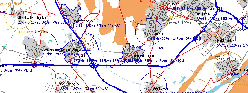 You can see the gray default circles, the orange auto sized places and the blue osm data based places (by radius or by area/way).