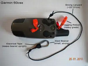 If traveling with a lot of gear and/or when there's a risk of dropping/losing your GPS unit, it's good to rig up your GPS so it attaches to you. Here's an example photo. Just attach a carabiner to a secure d-ring or loop on your belt/vest/pack etc. Attaching bright colour flagging ribbon is very helpful to find the device if you do drop it in a place where it blends into the terrain like in forested regions. (This setup also works great for other types of gear as well ie. field book, compass, range finder etc.)