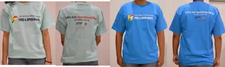 User:indiebio designed a T shirt and sticker for the SotM2020 Online conference. As it was a remote conference people were free to print these themselves. Imagico improved on the design.
