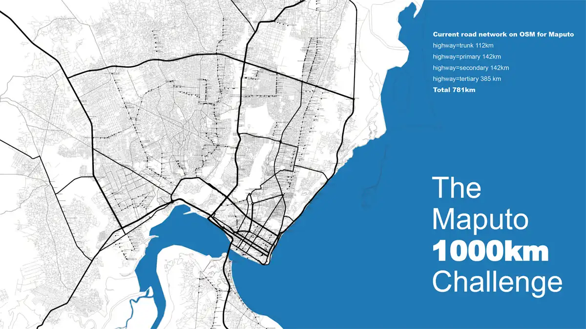 - Edit 1000km of OSM ways for Maputo, including clean-up of 781km existing ways, and addition of +200km new ways. Edits will include updating attributes like highway=*, surface=*, oneway=*, smoothness=*, name=*, among others.