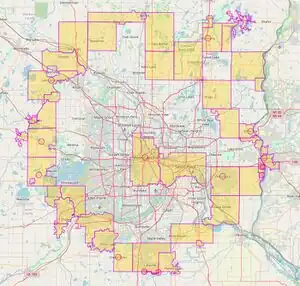 An OSM "helper" key (MN_metro=TC) has been developed that is used to mark the “edge cities” of the metropolitan area. The key is used on each city that is both within the area and next to an area that is not. The area is shown below based on an overpass turbo query. The selection criteria in the query were chosen to show both the edge cities and Minneapolis and St. Paul.