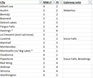 - Cities with ** (two of them) may be considered part of Tier 0 (the Twin Cities area). [This can be seen in the Tier 0 discussion about the metro Twin Cities above.]