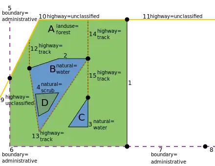 Way 2 used to be the whole boundary of lake B is also split. The ways 12, 13, 14 and 15 are added and tagged with highway=track. There are own map features for ways 5 to 15 and thus they are tagged with them regardless whether they are members of multipolygons because they aren't areas.