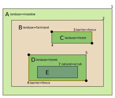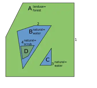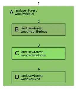 Multipolygon A describes the meadow A, multipolygon B the farmland B, multipolygon C the forest C and multipolygon D the forest D: