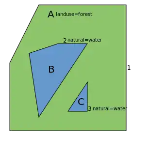 Closed way 3 is added within forest A and tagged with natural=water describing lake C. Forest A which is tagged with landuse=forest isn't a simple ring anymore. It's now the area enclosed by way 1 minus lakes B and C.