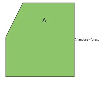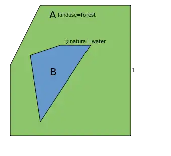 Closed way 1 is drawn and tagged with landuse=forest describing forest A. Tagging a closed way with a tag indicating an area results in drawing an area. This kind of shortcut works for simple areas the outline of which consists of one single way, and which do not have holes. The same could be done with a multipolygon but this would just complicate a simple case.