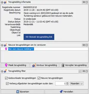 Via het paneel "Nieuwe terugmeldingen om te versturen" kun je een of meerdere terugmeldingen aanmaken. Het is hierbij (nog) niet mogelijk een BAG id op te geven, maar de coordinaat van de melding is voldoende om de melding in behandeling te nemen.