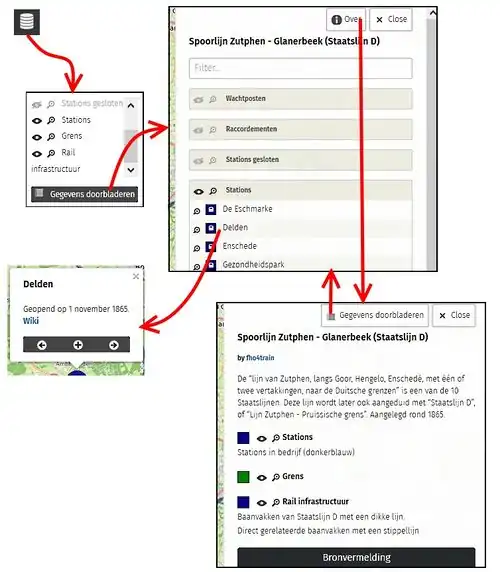 Klikken van Gegevens doorbladeren opent een panel aan de rechterzijde waarmee alle objecten van de lagen aangeklikt kunnen worden. Bij de objecten wordt dan een pop-up getoond. Er is ook een knop om de informatie van de kaart zelf te zien. Het plaatje geeft aan hoe dit globaal werkt.