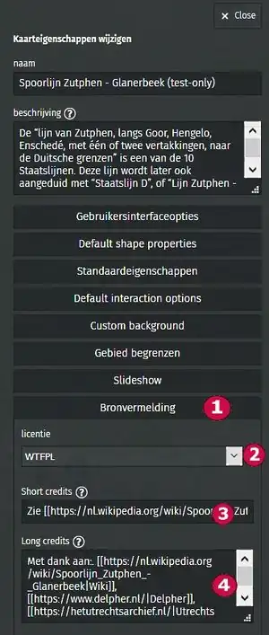 - Stap 6: Invullen van Long credits (4). De tekst van dit veld wordt getoond in het Over deze kaart panel, onder Bronvermelding.