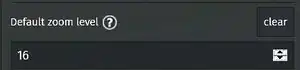 - Zet de gewenste zoom instelling met Default zoom level. Dit getal toont bij waarde: 1:hele wereld, 15:~2 km, 16:~1 km, 20:~100 meter