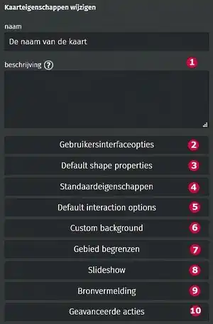 De eigenschappen kunnen gezet/gewijzigd worden met panel Kaart eigenschappen wijzigen.