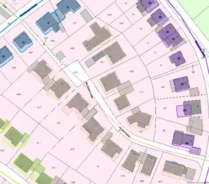 Unabhängig von den eigentlichen Verwaltungsgrenzen sind zusätzlich die Kataster-Grenzen von Gemarkungen und Fluren als eigener Layer und von Flurstücken in den ALK-Layern ersichtlich. Aus diesen Grenzen können aber keine verlässlichen Rückschlüsse auf Verwaltungsgrenzen gezogen werden. Ebenso ist die Sinnhaftigkeit der Katastergrenzen, insb. bei einzelnen Flurstücken, zweifelhaft und es existiert bisher auch kein dokumentiertes Tagging-Schema hierzu. Hilfreich sind die Katastergrenzen bei der Ermittlung von Grundstücksgrenzen, zB. um die Gelände einzelner Firmen in Gewerbegebieten zu erfassen. |