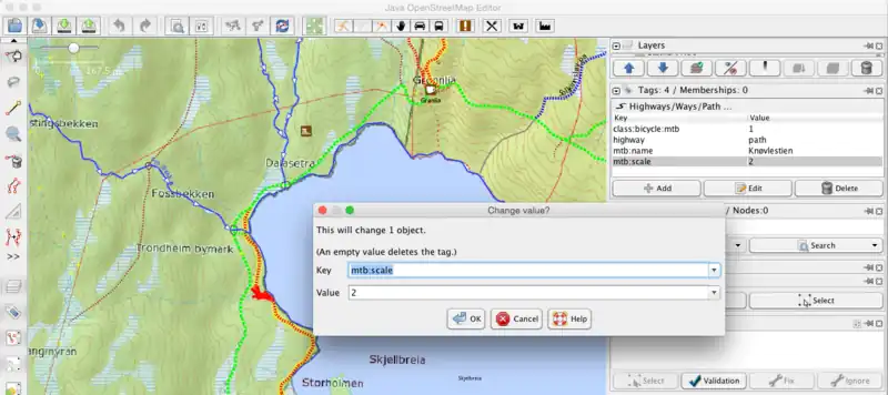 highway=path(sti) ellerhighway=track(traktorveg/kjerreveg), og for å beskrive syklingen legger du til tags beskrevet ovenfor under #Mest brukte tagger for terrengsykling. Se også skjermbildet nedenfor. - Når du har gjort endel redigering trykker du på