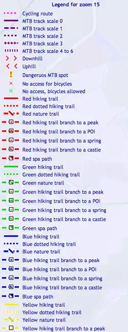 | MTBMap.cz | Europa | Oppdateres omtrent ukentlig eller månedlig. Kartet inneholder/viser mye informasjon. Bruker ikke fargekoding for å skille på mtb:scale=* - bruker istedet farger for å skille mellom ulik fargemerking av stier, og bruker linjestilen (heltrukket, stiplet, osv.) for å vise vanskelighetsgrad/mtb:scale=*.