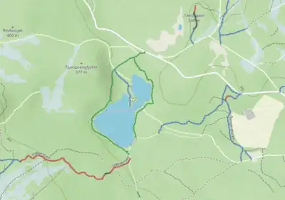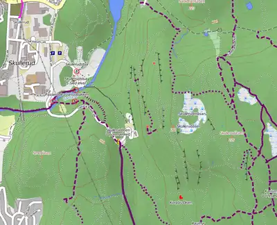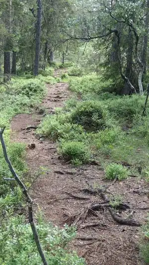 Rød | Sti med lengre og vanskeligere innslag av røtter, steiner og tekniske eller bratte partier. |