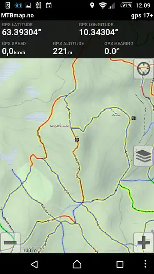 2. Legg til MtbMap via Maps->Add og velg Flexible URL tile definition. Benytt mtbmap.no som navn og følgende som Map url: http://c.tiles.mtbmap.no/osm/mtbmap/{2}/{0}/{1}.png Legg inn min og max zoom for kartet. Dette kan du finne i en nettleser. For eksempel vil egnede verdier for MTBMap.no være min zoom 5 og max zoom 17, men vær obs på at kartet kun dekker opp til zoom 14 for mange områder (zoom 15-16 finnes hittil kun for Trondheim, Oppdal, Verdal og Røros). 3. Pass på at "Shown" er valgt for de kartene du ønsker å ha tilgjengelig (under Maps i menyen). Merk at du her også har "Statkart Topo 2 (Norway)" tilgjengelig. 4. For å vise kartet i appen; trykk på verdenskartikonet oppe til høyre, velg her mtbmap.no |