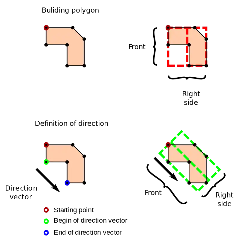 Points describing direction are write using relation. This allow for buildings with shared walls.