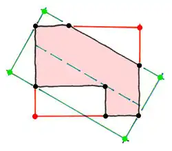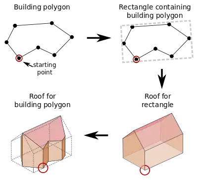 To generate 3D model for building polygon which is not rectangle at first place we need to find the smallest rectangle containing building polygon. It is easy to generate shape of building roof for rectangle and it is easy to place dormers using this rectangle.