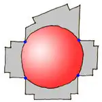 In case of type 5.6 we find the biggest circle inside building polygon. The circle is base for roof sphere (red surface on image, shared points are marked blue) rest of roof is generated flat (gray color).