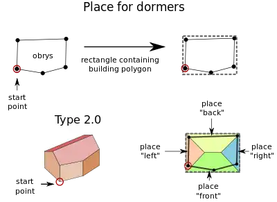 For roofs base on rectangle there are four place where we can put dormers. Places are connected with edges of rectangle containing building polygon. Example image:
