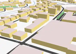 Writes an OpenGL rendering of the 3D model generated from example.osm to image.png. The rendering uses a perspective projection, with the defined coordinates for camera position and look at.