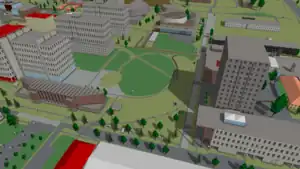 OSM2World (osm2world.org) is an application that converts OpenStreetMap data to three-dimensional models. The models can be exported to different formats.