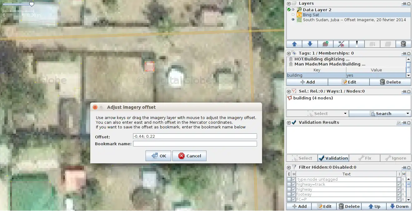 and select the new imagery in the list. If needed, move the pop-up window showing the x,y offset out of the way. - Move the imagery so that the vector object (eg mapped building or building angle) is properly and exactly aligned on the new imagery. Click on OK