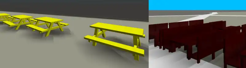 OLD: An student from the [3] Rapperswil branched OSM2WORLD and implemented amenity=="table". I also got the code extensions and adapted them to Javascript and OSM go. The cool thing is: sizes, numbers of chairs and colors are calculated from given OSM-Tags. There is a lot of geometry transforming and rotating. So I made an class/library to handle parts of node-objects and implemented some more types: