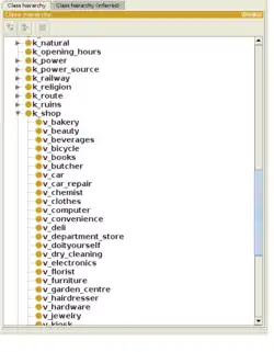 In OSMonto, tags are decomposed into a hierarchy according to the keys: the key becomes a superconcept of its values. This approach was followed whenever the value was an OSM constant rather then a string/numeral. Since it is possible that a key and a value have the same name whilst the names of the concepts are required to be unique in OWL, we decided to prefix all keys with k_ and all values with v_.
