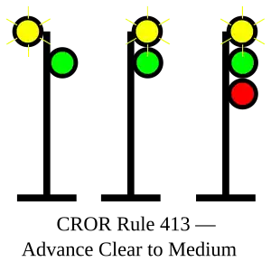 | 413 | Advance Clear to Medium | Proceed, approaching second signal at MEDIUM speed |