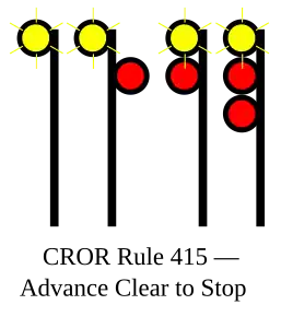 | 415 | Advance Clear to Stop | Proceed, next signal is displaying Clear to Stop, be prepared to stop at second signal. |
