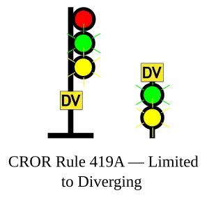 | 419A | Limited to Diverging | Proceed, LIMITED speed passing signal and through turnouts, approaching next signal at DIVERGING speed. |