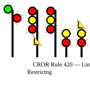 | 420 | Limited to Restricting | Proceed, LIMITED speed passing signal and through turnouts, next signal is displaying Restricting Signal. |