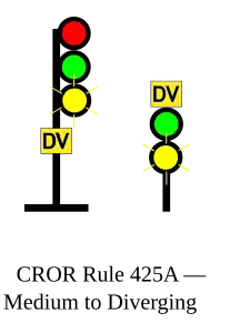| 425A | Medium to Diverging | Proceed, MEDIUM speed passing signal and through turnouts, approaching next signal at DIVERGING speed.