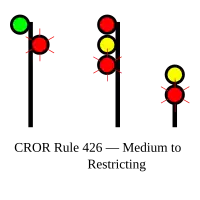 | 426 | Medium to Restrictinig | Proceed, MEDIUM speed passing signal and through turnouts, next signal is displaying Restricting Signal. | ![]() |