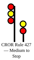 | 427 | Medium to Stop | Proceed, MEDIUM speed passing signal and through turnouts, preparing to stop at next signal | ![]() |