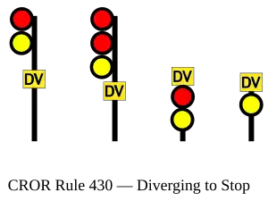 | 430 | Diverging | Proceed at REDUCED speed, not exceeding DIVERGING speed passing signal and through turnouts.
