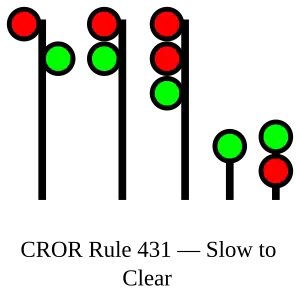 | 431 | Slow to Clear | Proceed, SLOW speed passing signal and through turnouts. |