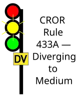 | 433A | Diverging to Medium | Proceed, DIVERGING speed passing signal and through turnouts, approaching next signal at MEDIUM speed.