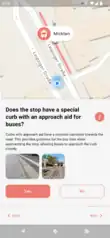 When getting close to a public transport stop the app will load and show markers for all elements that miss some accessibility information. Tapping a marker will reveal a list of questions to obtain the missing information. After going through the questions, a summary of the collected information is presented including the ability to eventually upload the data to OpenStreetMap.
