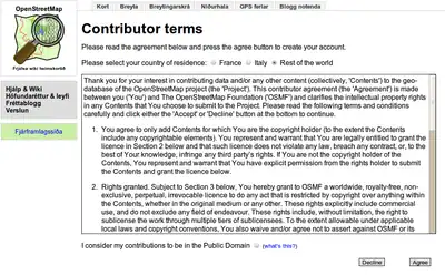 The following is a work in progress summary of the OpenStreetMap Contributor Terms 1.0. Currently the terms are only available as a long legal document in English, Italian and French. Users signing up for a new account are unlikely to read them or understand them.